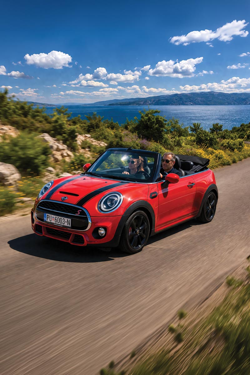 Experience Istria the way true lovers of authentic and elegant adventures do — freely, calmly and without the pressure of a group. The Mini Cooper Cabrio S turns every curve into pure driving pleasure with its iconic go‑kart feeling.